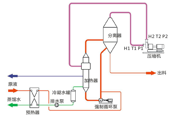 MVR蒸發(fā)器采用壓縮機(jī)提高二次蒸汽的能量,并對提高能量的二次蒸...